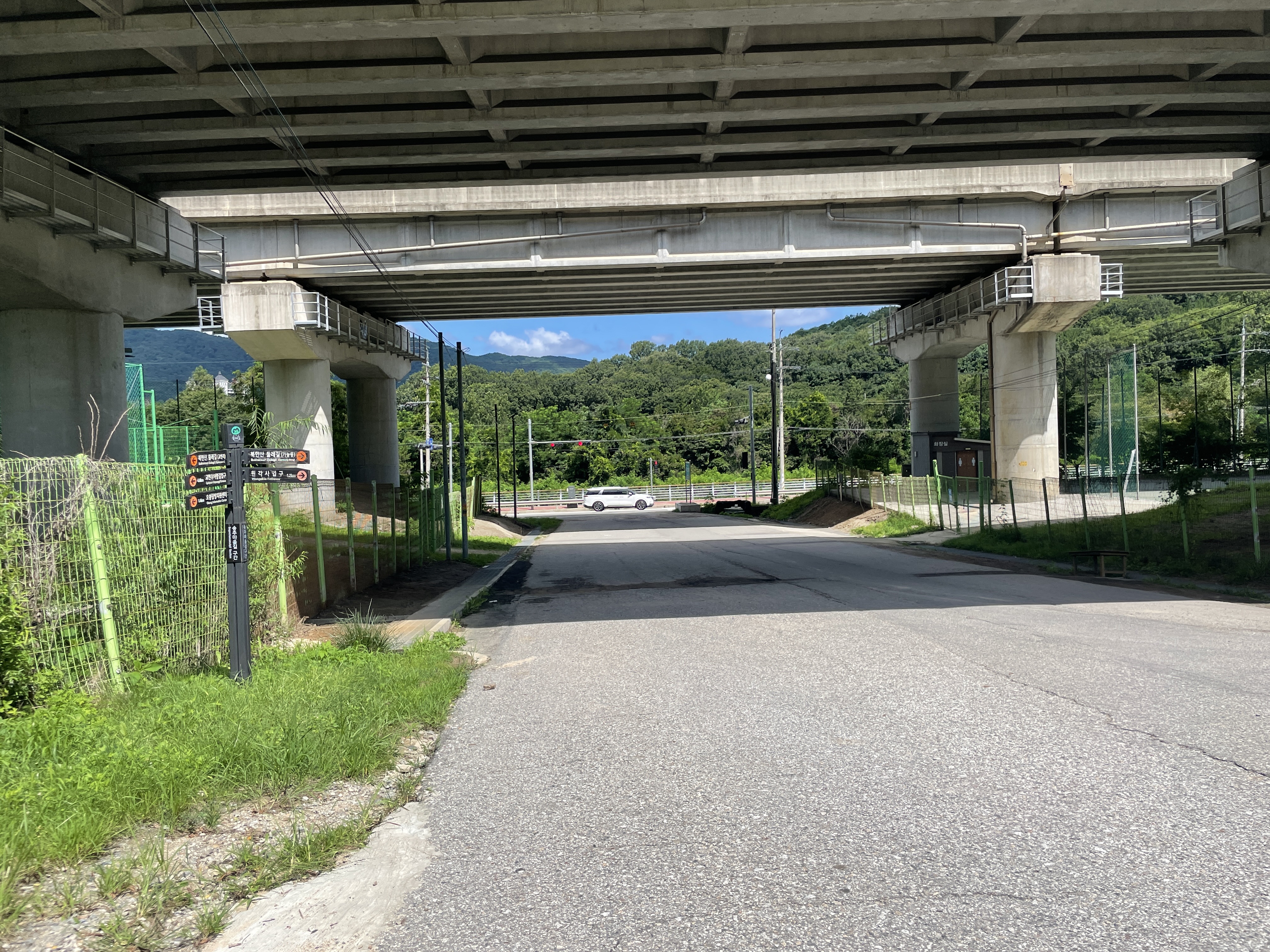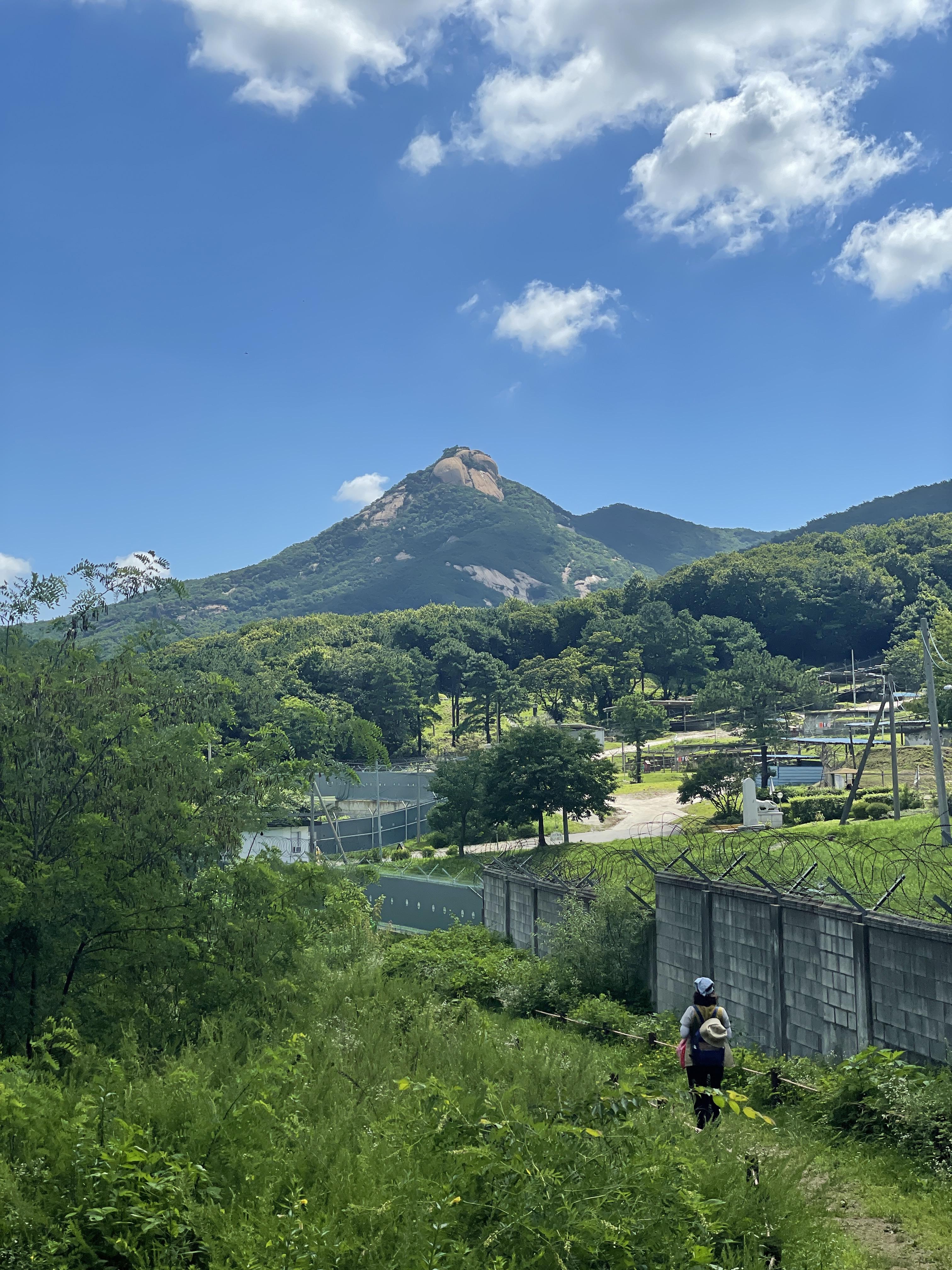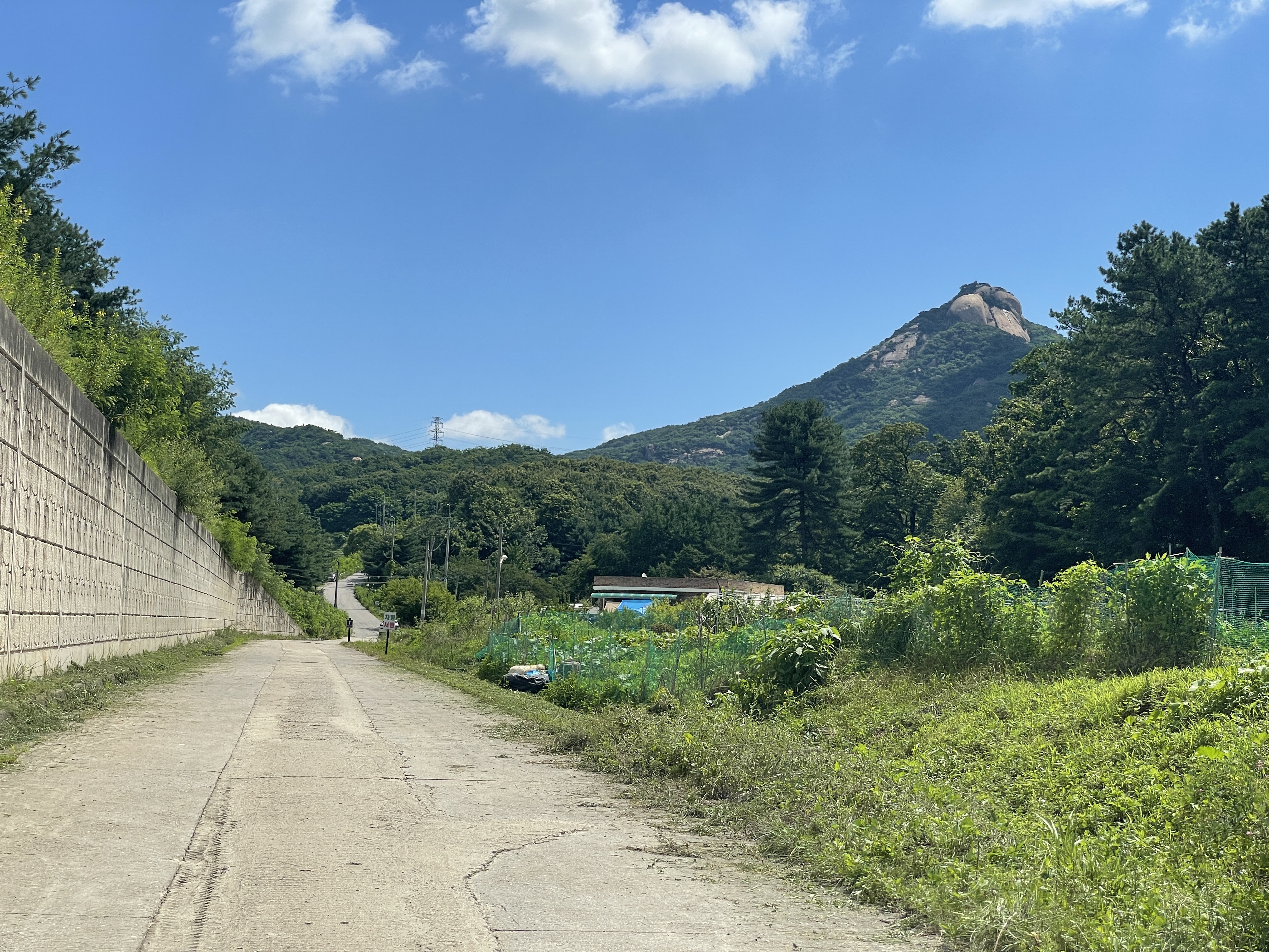 송추 주차장을 둘러 안내되는 도로 길을 따라 걷다 보면 다시금 산길을 만날 수 있다. 완전 산 안쪽은 아니고 도로 옆에 붙어 있는 길이라 차 소리가 들리기도 한다. 풀들이 우거진 작은 길들을 따라 걷고 계단을 내려가다 보면 어느샌가 다시 산 바깥으로 이어지는 길로 나가게 된다. 딱 나오게 되면 탁 트인 느낌과 함께 사패산 봉우리가 떡하니 보여 정말 멋있었다. 이곳부터는 사패산을 감상하며 길을 걸을 수 있다.