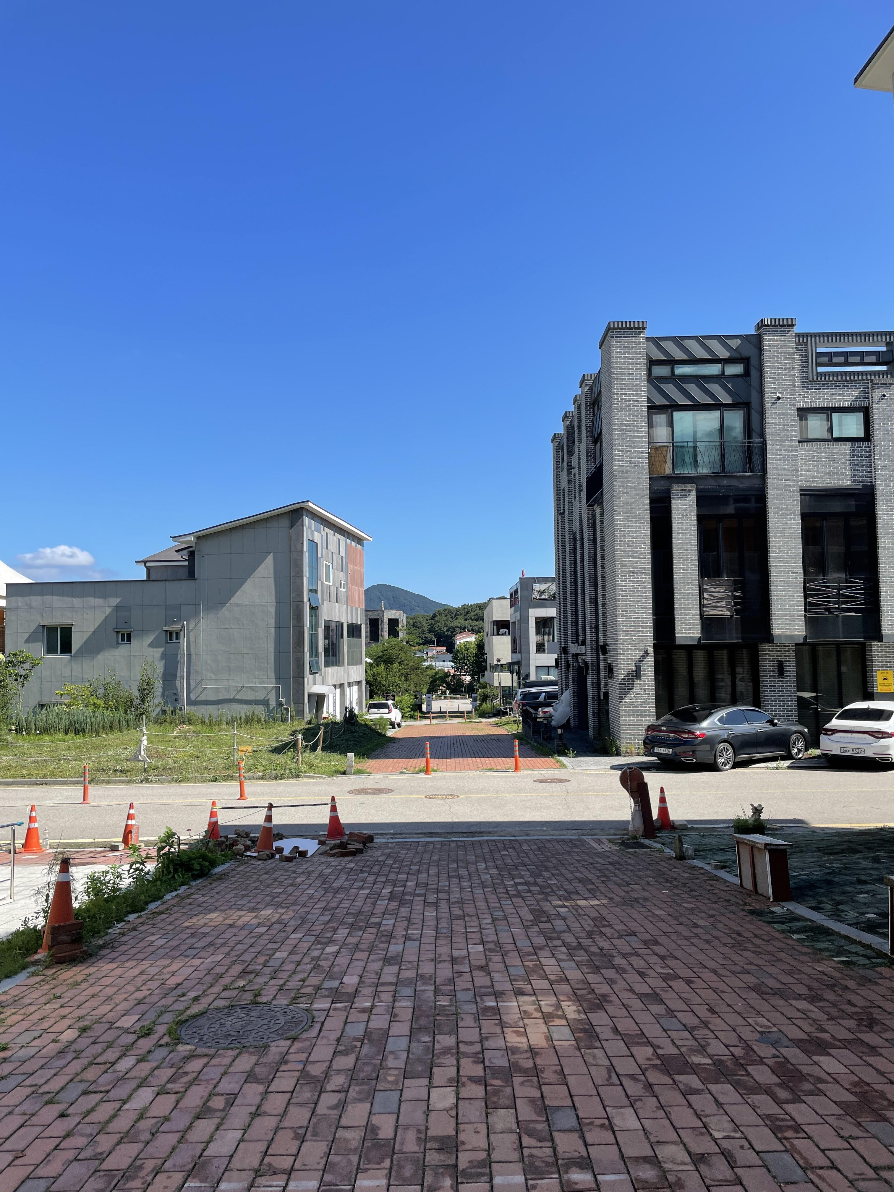 상가를 나와 다리를 건너려는데 계곡 옆쪽으로 길이 예쁘게 되어있었다. 상가 길이 둥글게 되어 있었는데 빙 둘러서 올 걸 그랬나 싶었다. 계곡엔 물이 흐르고 있었는데 다리를 건너다 오른쪽을 보니 산 뷰가 매우 좋았다. 왜 이렇게 좋은 장소를 놔두고 이상한 곳에 포토 포인트를 두었는지 조금 의심스럽다.. 너무 예뻐서 사진 열심히 찍다 정작 본인들 기념사진을 안 찍은 것이 좀 웃기지만 날씨가 쨍쨍하니 맑은 덕에 눈 호강하고 왔다.