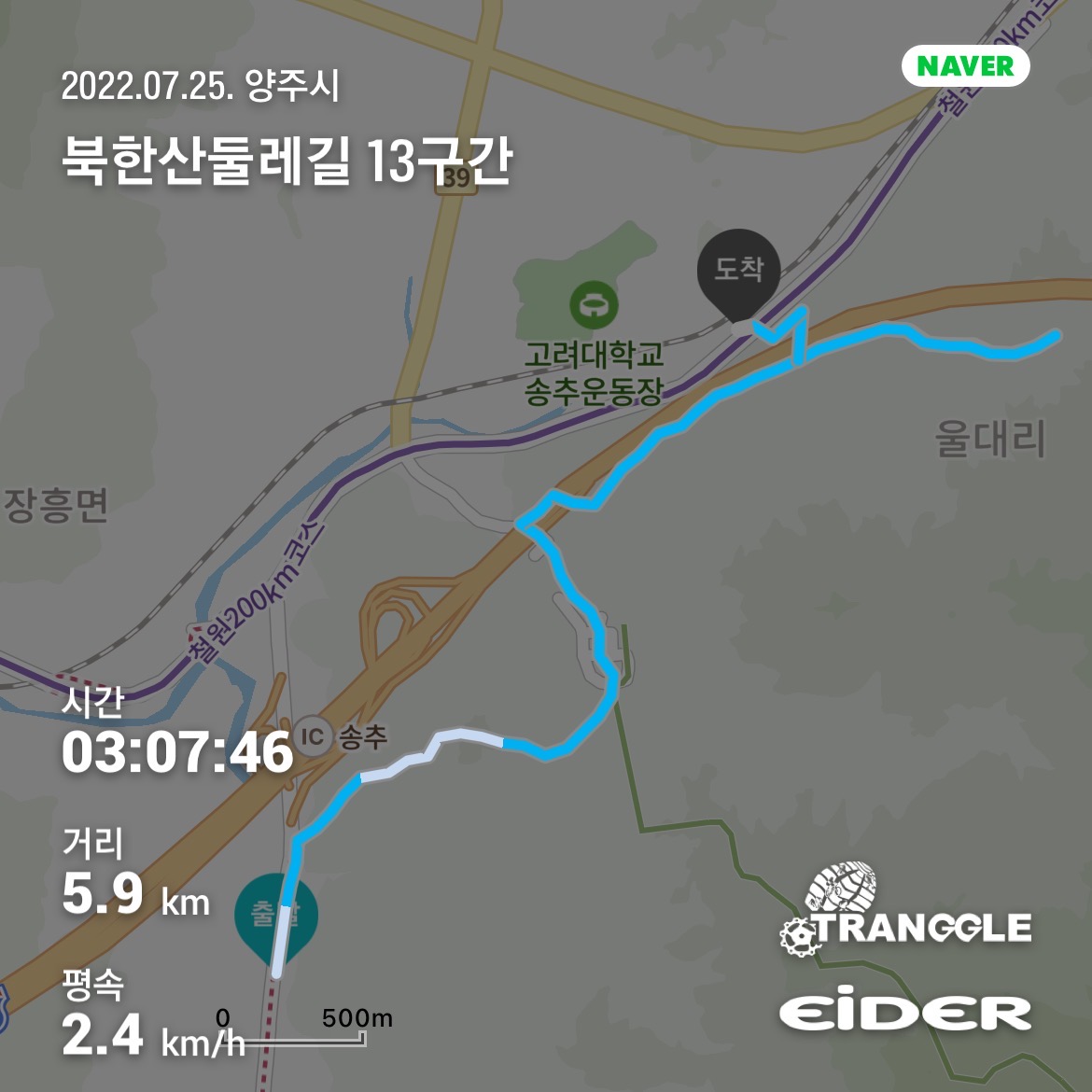 확실히 경기 쪽으로 넘어오면서 길도 살짝 정비되지 않은 느낌이나 사람이 다니지 않는다는 느낌을 받았다. 특히 초반에 있는 산길은 그렇게 재밌는 요소는 없었는데 그나마 중간에 만나는 송추 계곡 부근이 마음을 풀어줬던 것 같다. 난이도는 '하'라고 명시되어 있듯이 어렵지 않은 길들이 대부분이었다. 전체 거리가 꽤나 정확한 편인 것 같다고 느낀 것은 13구간 길이가 5km라고 표기되어 있는데 다시 돌아오는 길이 800미터쯤 된다. 측정된 길이가 정확히 그쯤이니 거리상 거의 맞는 것 같다. 만약 원래 종료 지점까지 가지 않고 두 번째 탈출 포인트에서 종료한다면 약 4.2km 정도 될 것 같다.