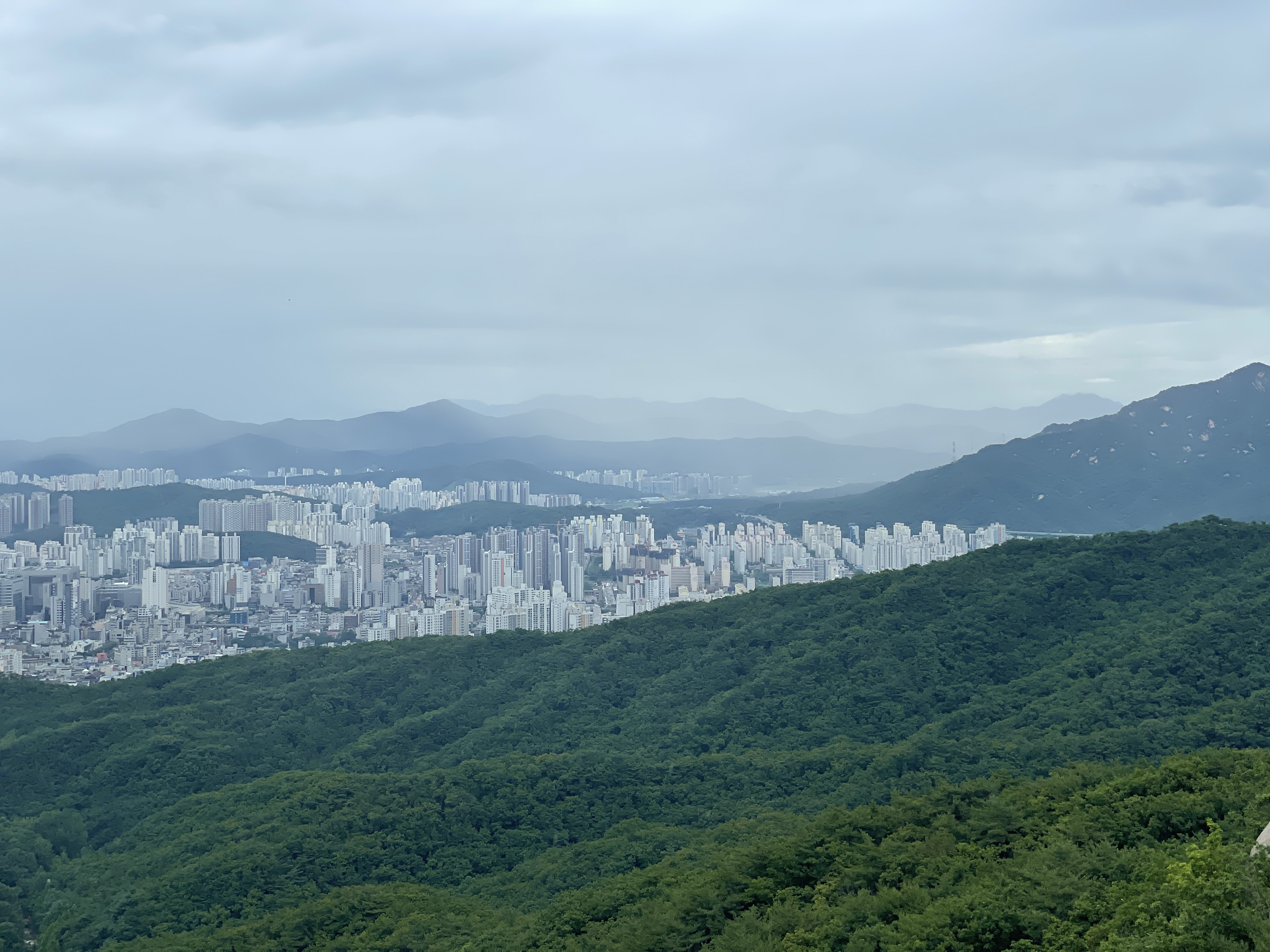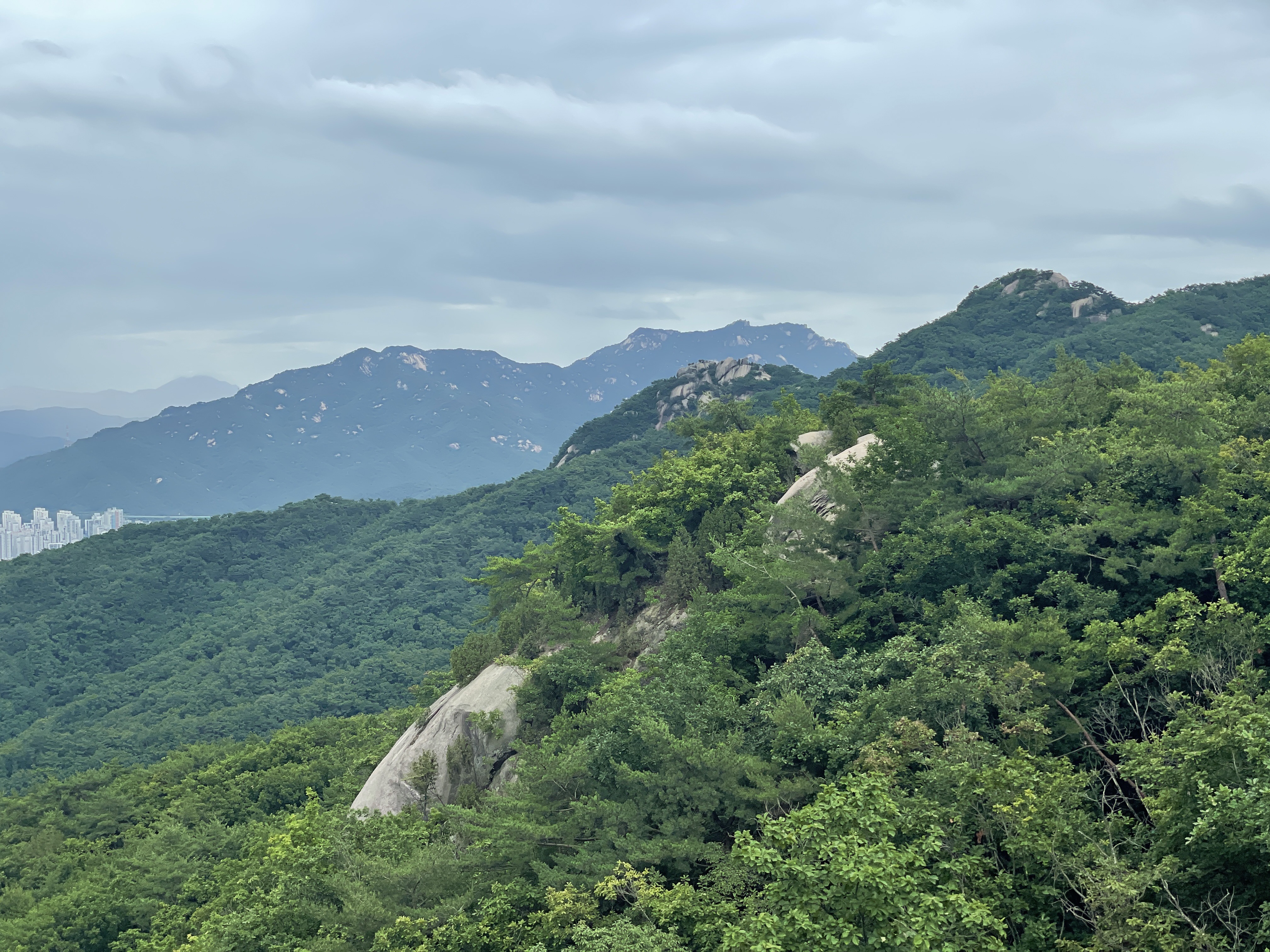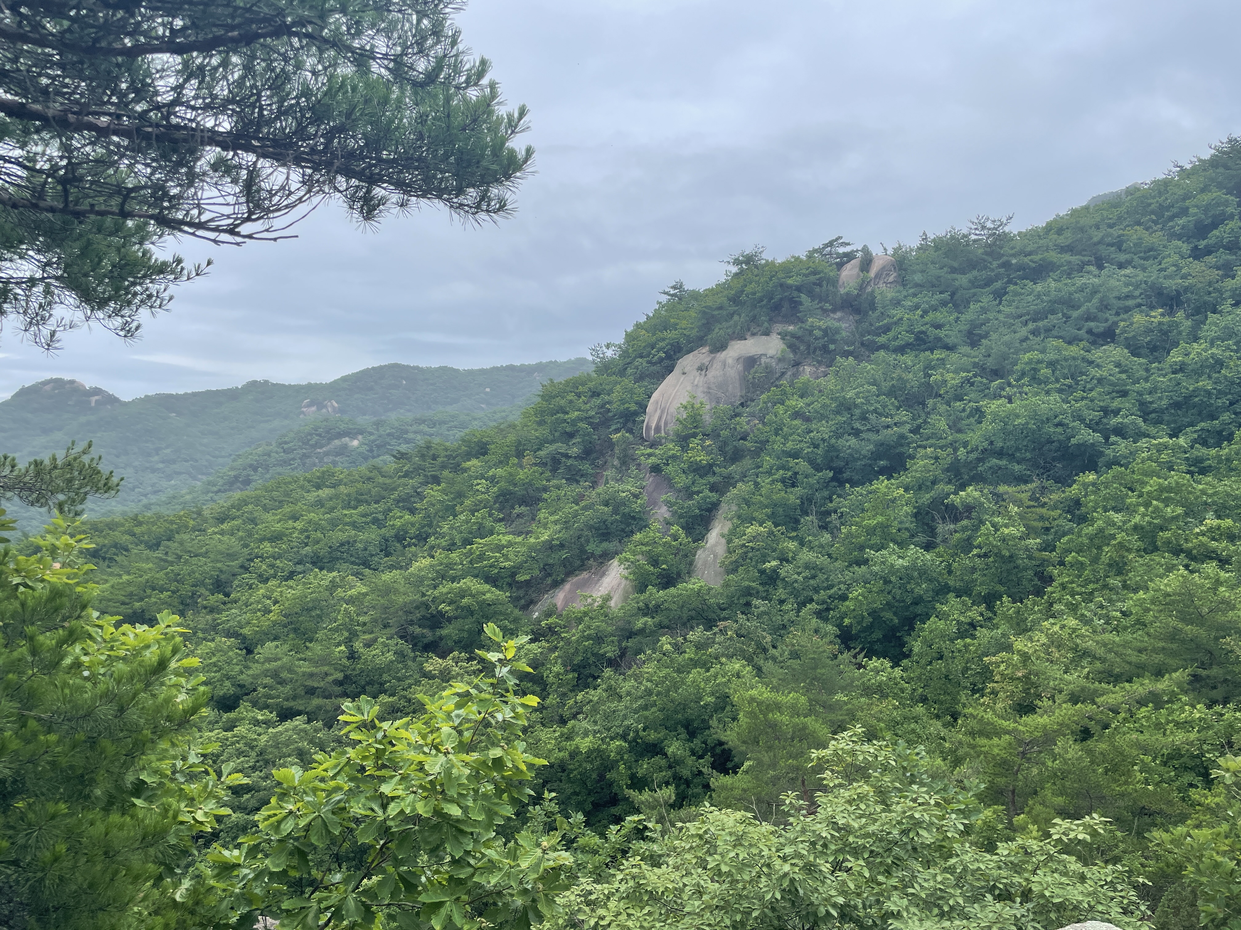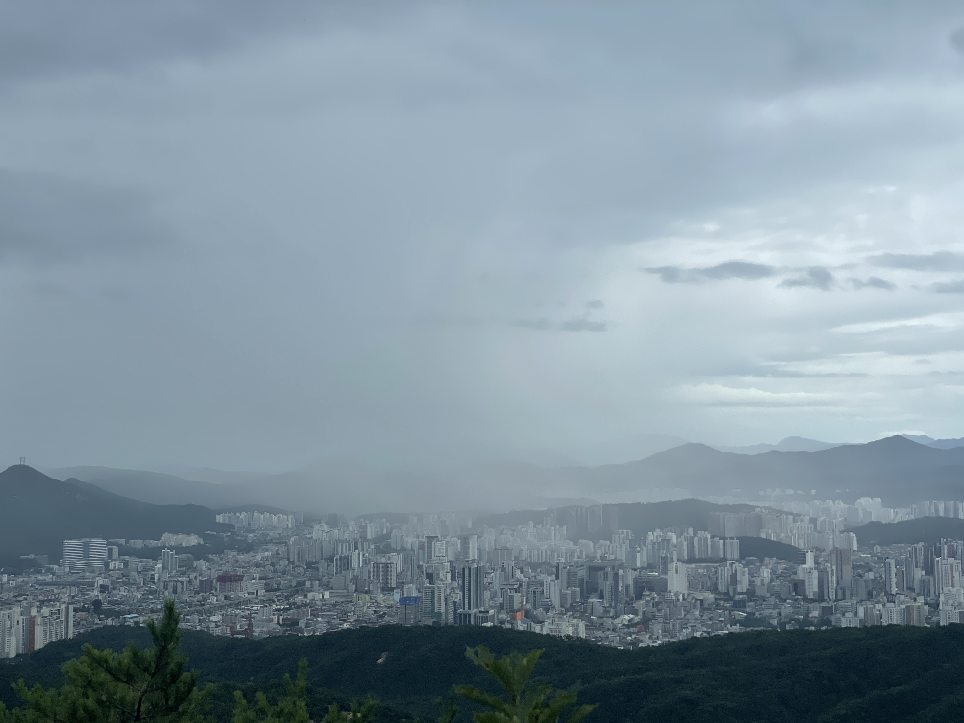 그리고 그 비구름은 우리가 있는 방향에도 살짝 지나쳐갔다. 비를 뿌리는 뿌연 것이 점점 우리를 향해 다가오고 있었고 주위를 덮기 시작하자 후두둑 비가 내렸다. 사실 산을 탈 때 비가 오면 어쩌나 싶었는데 솔직한 마음으로 이렇게 비가 조금 내리는 날은 오히려 산에 올라도 괜찮은 것 같은 느낌이었다. 뒤에 일정만 없었다면 조금 더 오래 비와 함께 경치를 감상하고 싶었달까. 조금은 아쉬운 마음으로 하산을 했다.