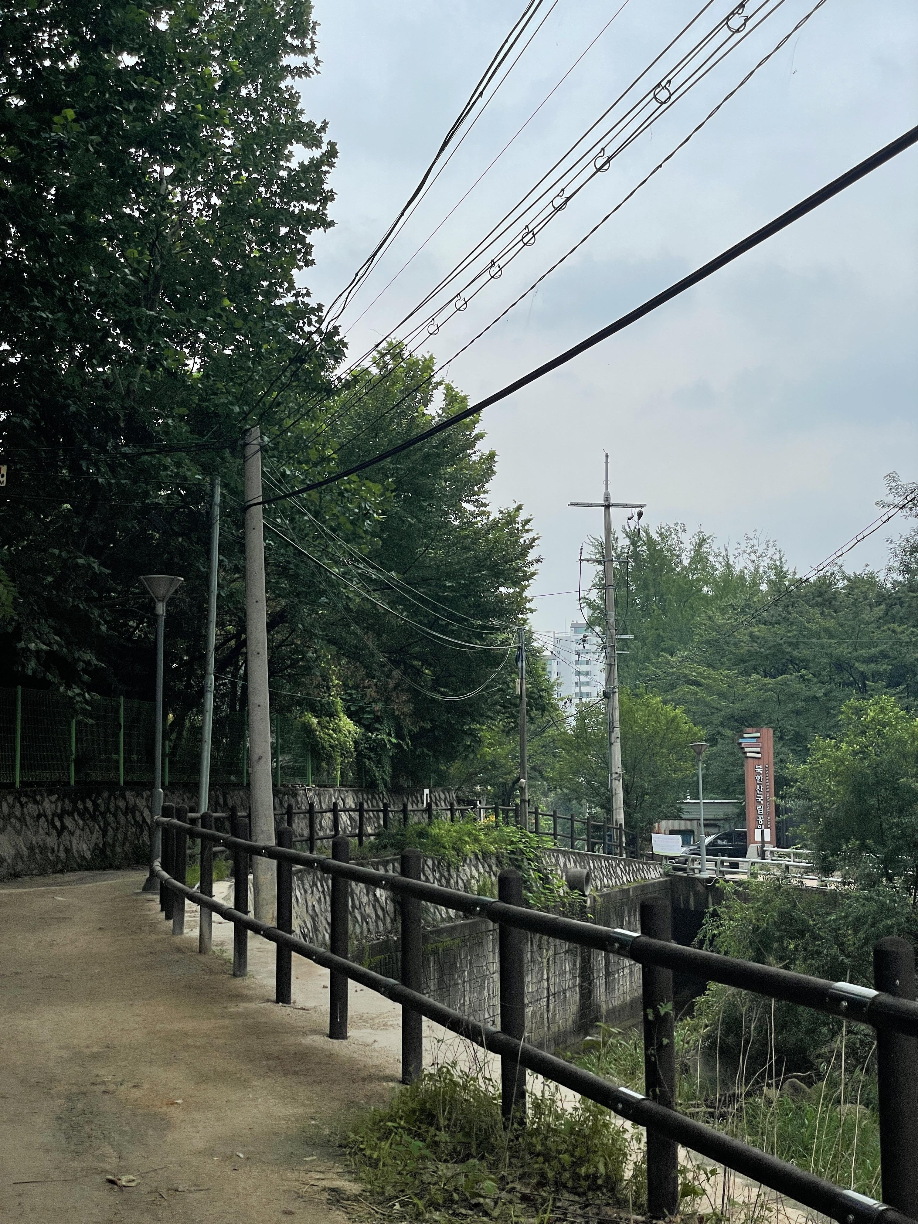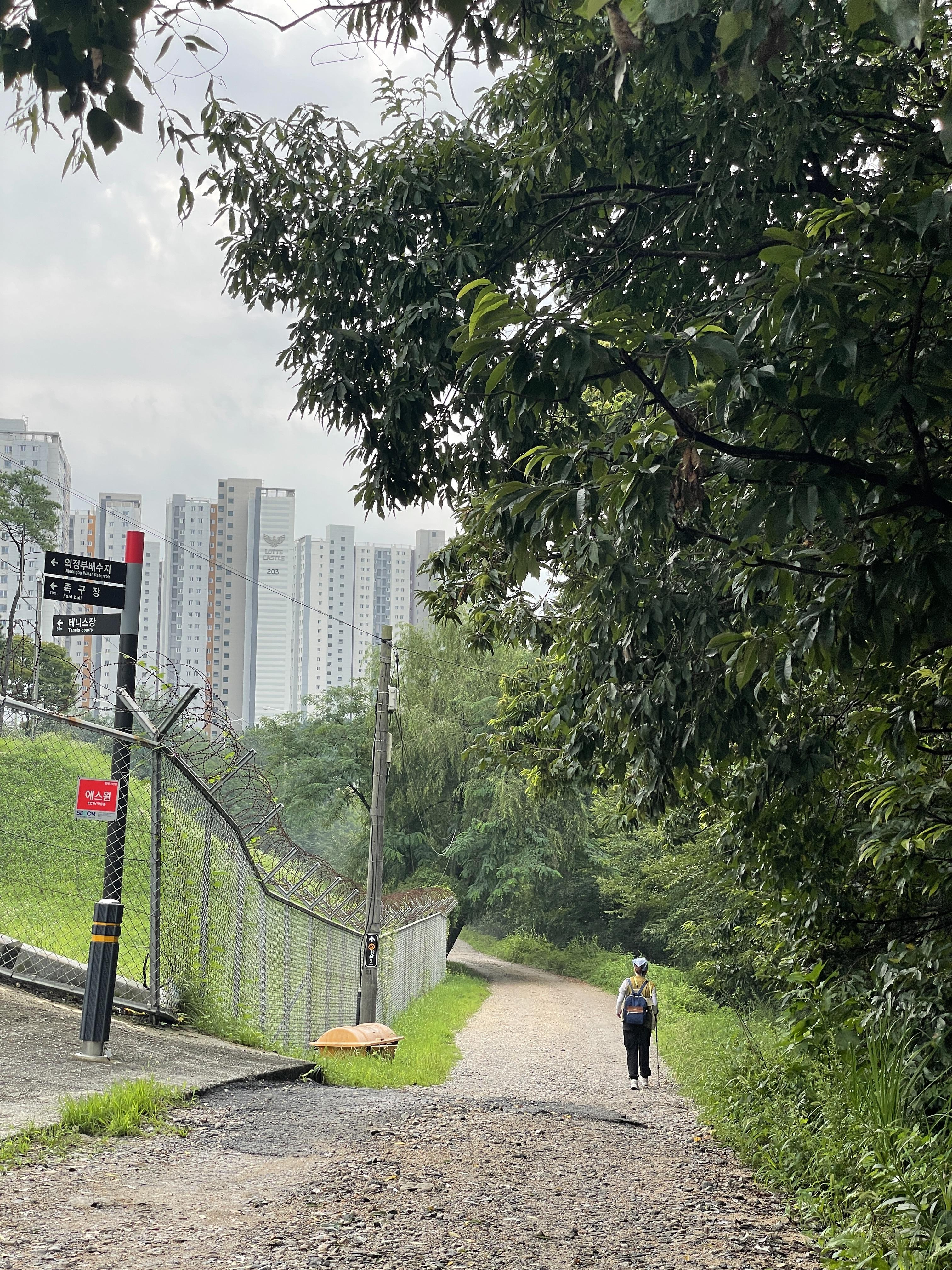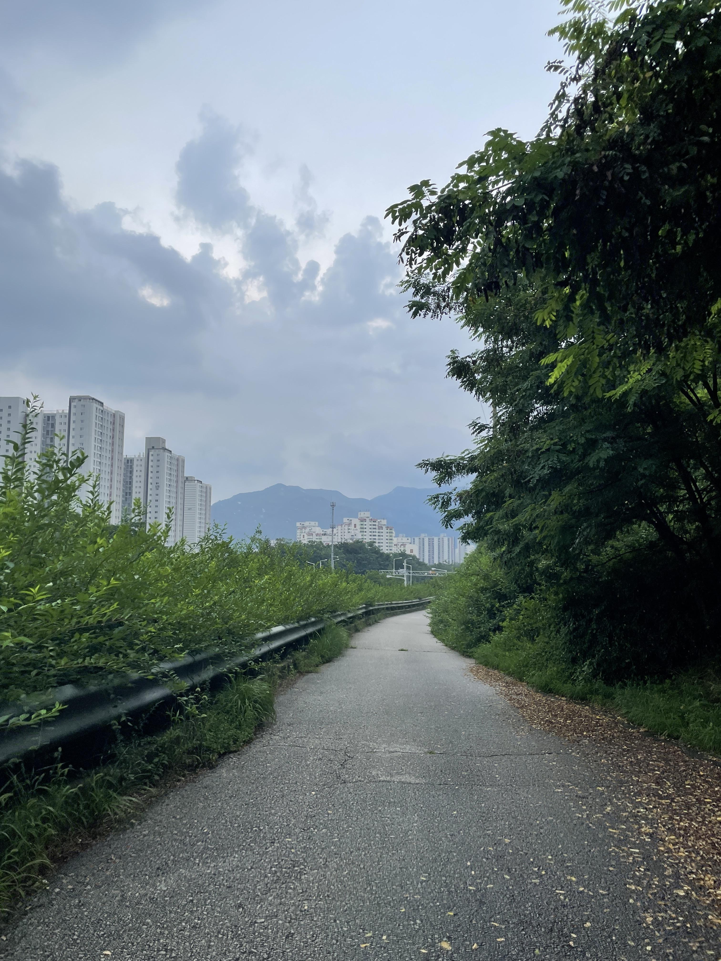 자박한 흙길과 아스팔트 길을 걸어가면 옆쪽과 앞쪽에 보이는 산과 서서히 보이는 아파트를 바라보고 자동차가 지나가는 소리를 들으며 걸을 수 있다. 뭔가 이제 시내로 왔다는 느낌이 새롭기도 하지만 역시나 그렇게 재밌는 길은 아닌 것 같다.