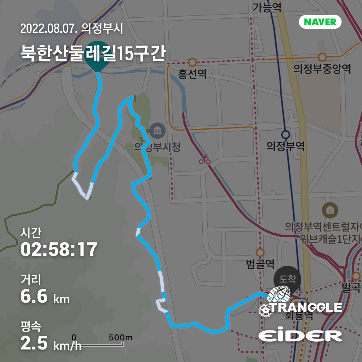 처음에 얘기했듯이 회룡탐방지원센터로부터 회룡역까지 나가는데 1km 이상의 거리를 추가로 걸어야 한다. 그래도 드디어 몇 구간만에 버스를 타지 않고 지하철을 바로 이용할 수 있는 구간에 다다랐다는 사실에 매우 좋았다. 회룡역으로 나가는 중에 식사할 만한 곳이 간혹 있었고 역 근처에도 꽤나 있었지만 오늘 시작하기 전에 라면도 먹고 배고플까 봐 사 가지고 온 김밥도 먹었더니 배가 고프지 않아 점심 식사는 스킵하기로 했다.