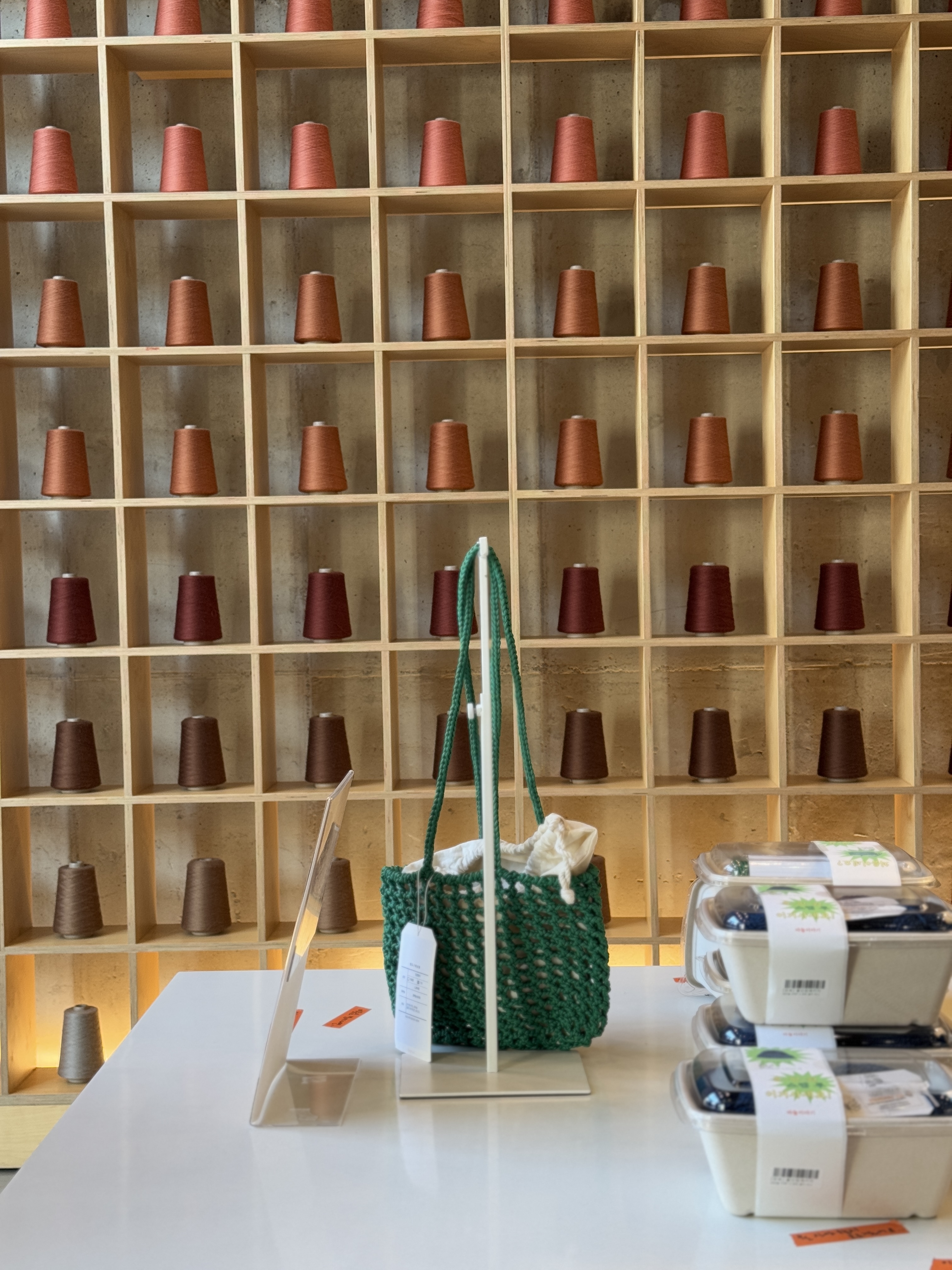 같이 다녀온 동생은 귀여운 가방 패키지를 구매했습니다. 이제 막 입문했는데 과연 어떻게 완성될지 정말 궁금하네요. 저도 선물로 줄 키링에 사용할 실 몇 볼을 구매했습니다. 사고 싶은 것은 참 많지만 아직 떠야할 것들이 많아 참았어요. 참고로 실이나 패키지 등을 구매하면 만원 당 하나씩 도장을 찍어줍니다.