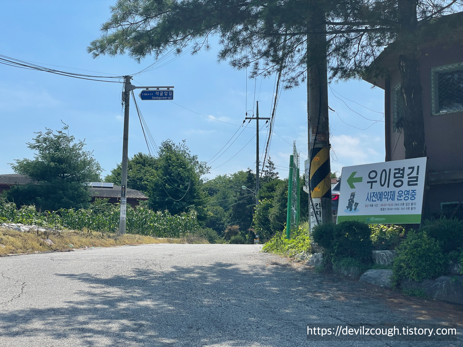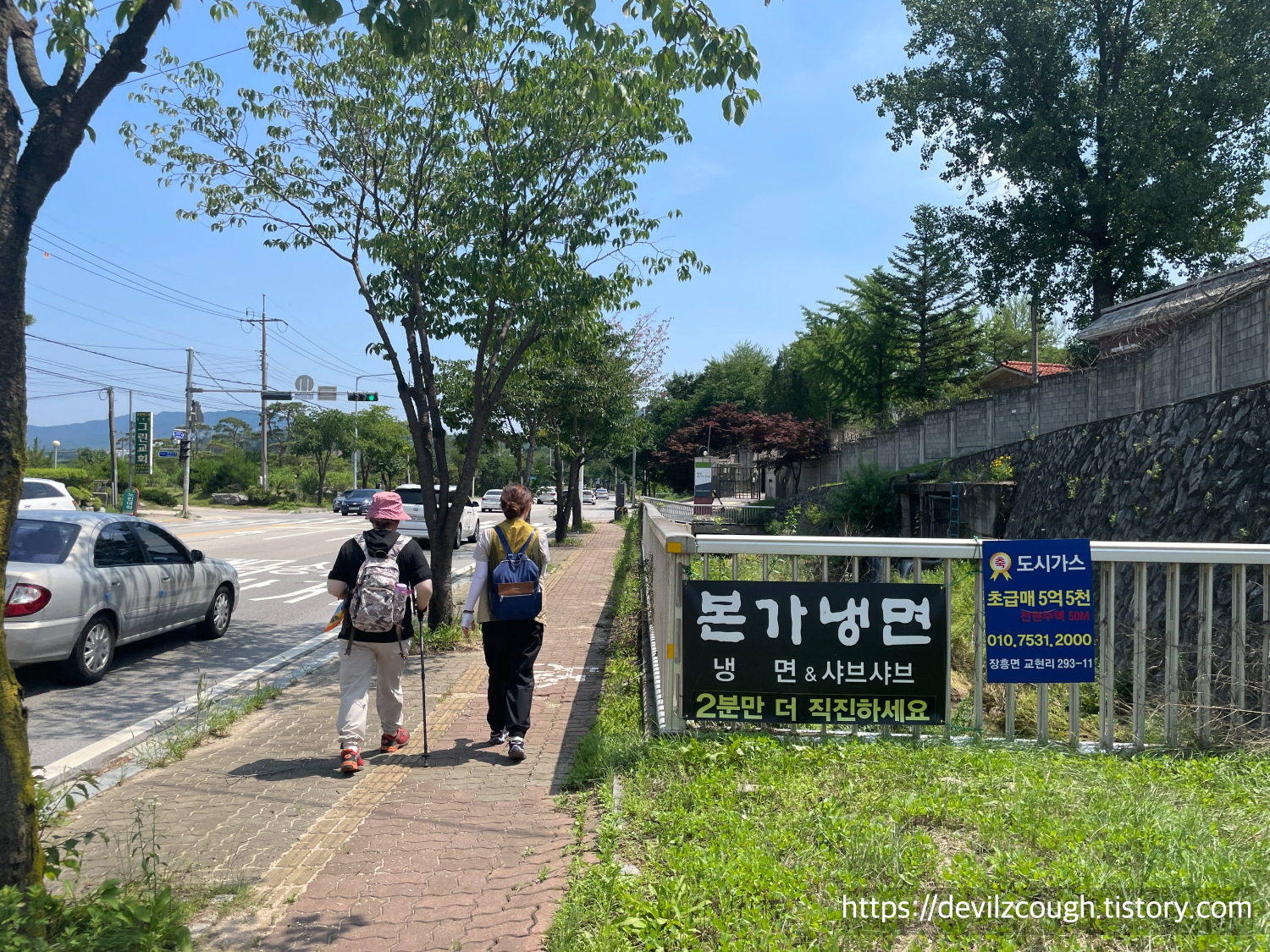 우리의 목적지는 냉면집이었다. 처음 보도로 나왔을 즈음부터 냉면 집까지의 거리는 약 1.5km쯤이었는데, 막 식당 정보를 찾아보았을 때 '2분만 더 직진하세요'라는 표지판이 있어 개인적으로 뭐지? 싶긴 했었다. 하지만 12구간 종료 지점으로부터 약 600m 정도 걸어야 하는 곳에 있었고 오전 11시 즈음엔 매우 더운 날씨였기에 빨리 도착하길 바라며 열심히 걸어갔다. 나중에 냉면집에 도착해서 그것에 대해 얘기했더니 "차"로 2분이라고 한다! ㅎㅎ 보도 길 옆에 작은 천이 흐르는데 물이 정말 정말 맑아서 들어가서 발 담그고 놀고 싶었다.