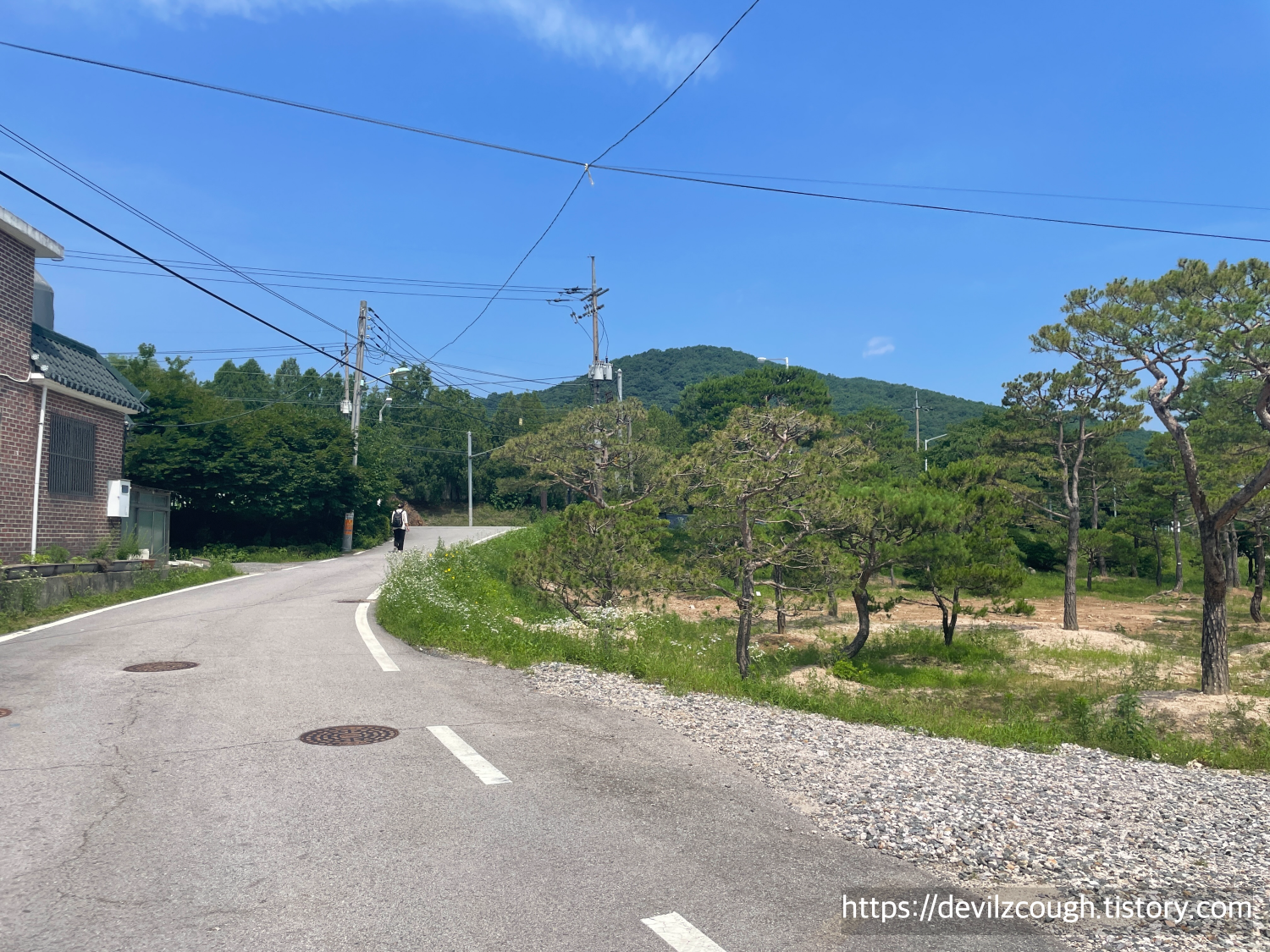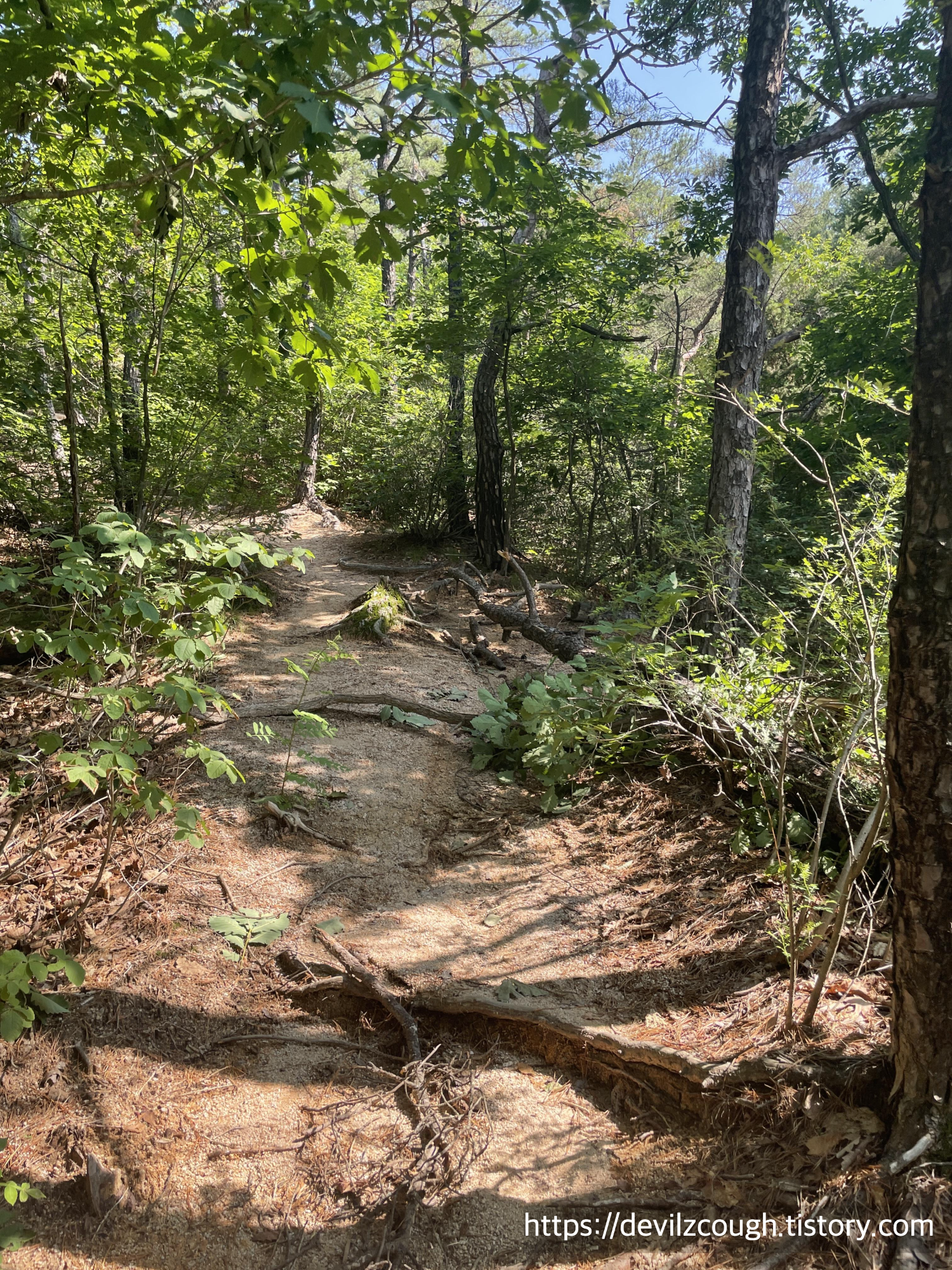 이번에도 마찬가지로 한 번 쭉 오르고 나면 산 아래까지 내려가는 길로 구성되어 있다. 계단이 많은 부분을 제외하고는 걷기 힘든 구간은 많지 않다. 내려가던 길 왼편에 소나무가 많이 있는 구간이 있는데 소나무도 길도 예뻐 보여서 서로 사진 찍어주며 지나갔다. 이렇게 내려가면 산길은 끝나게 되고 소박한 주택가(?)를 지나면 도로를 따라 보도로 걷게 된다.