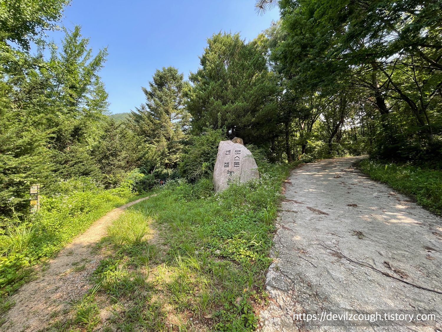 이렇게 쭉 내려오면 평지 길이 나온다. 오늘은 물 웅덩이가 곳곳에 있었는데 모기가 생기기에 딱 좋아 보였다. ㅎㅎ 가다가 조금 헷갈릴만한 곳이 있었는데 위 오른쪽 사진을 참고하면 '엔젤 보스톤 농원'이라고 적힌 바위 오른쪽에 큰길이 있다. 아무 생각 없이 가면 이쪽으로 가기 딱 좋지만 가야 할 길은 왼편에 작게 난 오솔길이다. 사진을 자세히 보면 둘레길 표지를 확인할 수 있다. 이 방향으로 다시 가다 보면 산길이 나온다.
