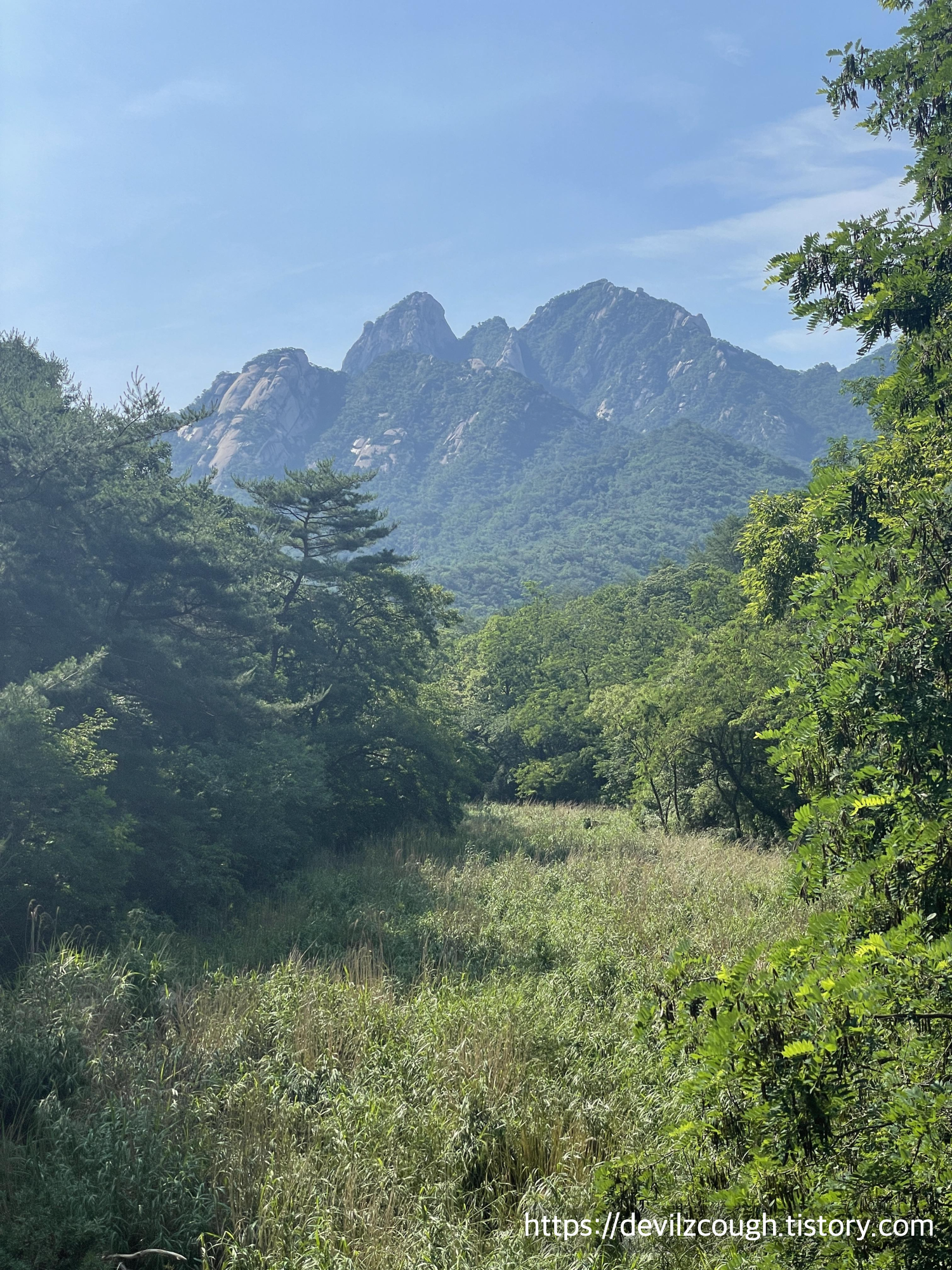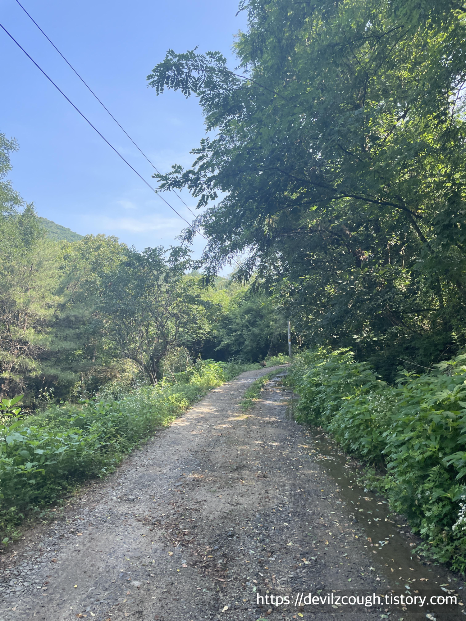 걷는 길에 간간이 보이는 봉우리들이 멋진 구간이었고 중간중간 물이 흐르는 것을 볼 수 있어서 좋았다. 오늘 정말 덥긴 했는지 평소보다 목이 마르기도 했고 밥 먹으려고 식당에 들어와 가방을 벗었더니 가방 멘 부분에 땀이 흥건히 젖어있었다. 이렇게 땀을 많이 흘린 건 내 인생에 처음... -- 기능성 상의의 필요성을 절실히 느낀 날이다. -- 만약 이렇게 더운 날 가고자 한다면 시간을 더 이르게 가거나 물을 충분히 챙겨서 자주 보충해주는 것을 권한다.